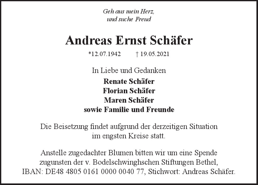 Hier finden Sie alle Traueranzeigen aus der Zeitung, die bisher für Andreas Ernst Schäfer erschienen sind. Weitere Traueranzeigen, die in der Zeitung erscheinen, werden hier ebenfalls aufgelistet