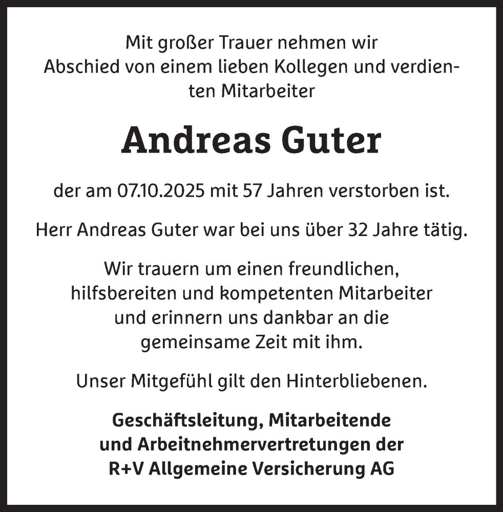 Hier finden Sie alle Traueranzeigen aus der Zeitung, die bisher für Andreas Guter erschienen sind. Weitere Traueranzeigen, die in der Zeitung erscheinen, werden hier ebenfalls aufgelistet