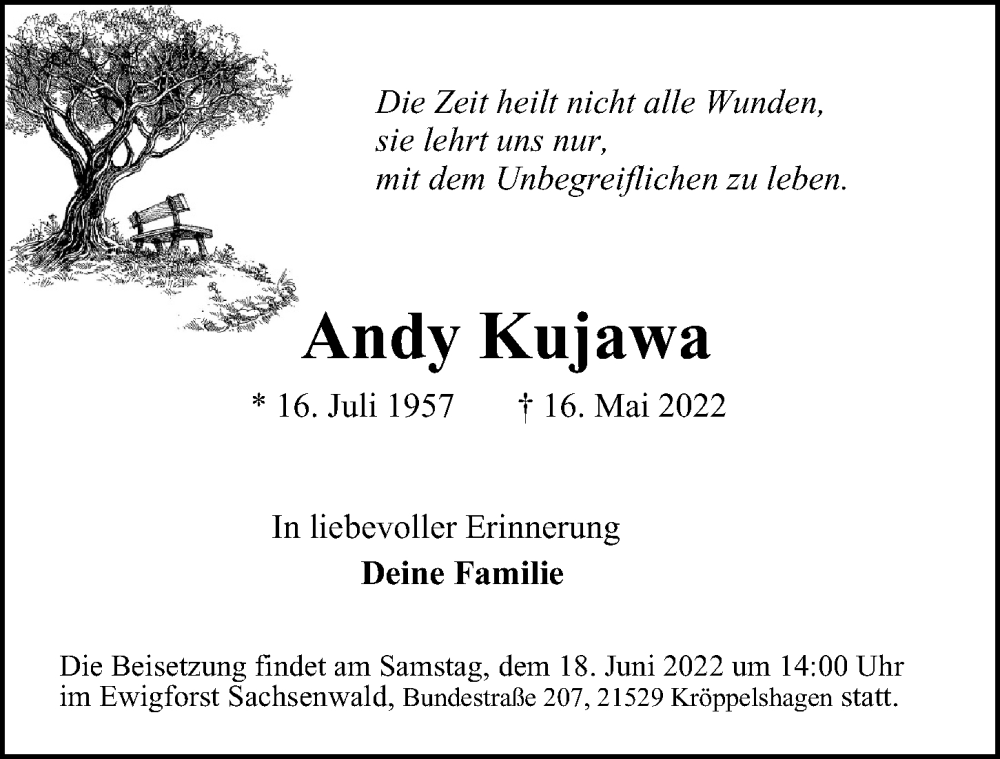 Hier finden Sie alle Traueranzeigen aus der Zeitung, die bisher für Andy Kujawa erschienen sind. Weitere Traueranzeigen, die in der Zeitung erscheinen, werden hier ebenfalls aufgelistet