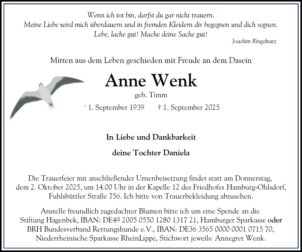Hier finden Sie alle Traueranzeigen aus der Zeitung, die bisher für Anne Wenk erschienen sind. Weitere Traueranzeigen, die in der Zeitung erscheinen, werden hier ebenfalls aufgelistet