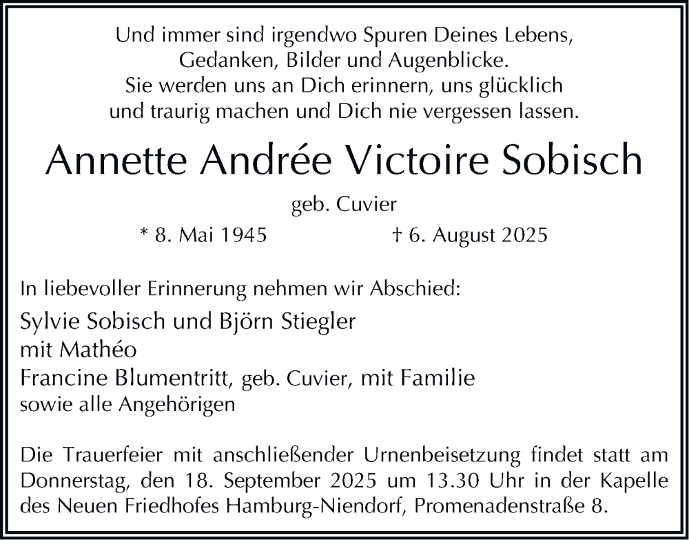 Hier finden Sie alle Traueranzeigen aus der Zeitung, die bisher für Annette Andrée Victoire Sobisch erschienen sind. Weitere Traueranzeigen, die in der Zeitung erscheinen, werden hier ebenfalls aufgelistet