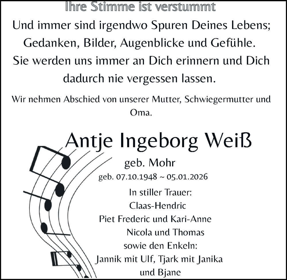 Hier finden Sie alle Traueranzeigen aus der Zeitung, die bisher für Antje Ingeborg Weiß erschienen sind. Weitere Traueranzeigen, die in der Zeitung erscheinen, werden hier ebenfalls aufgelistet