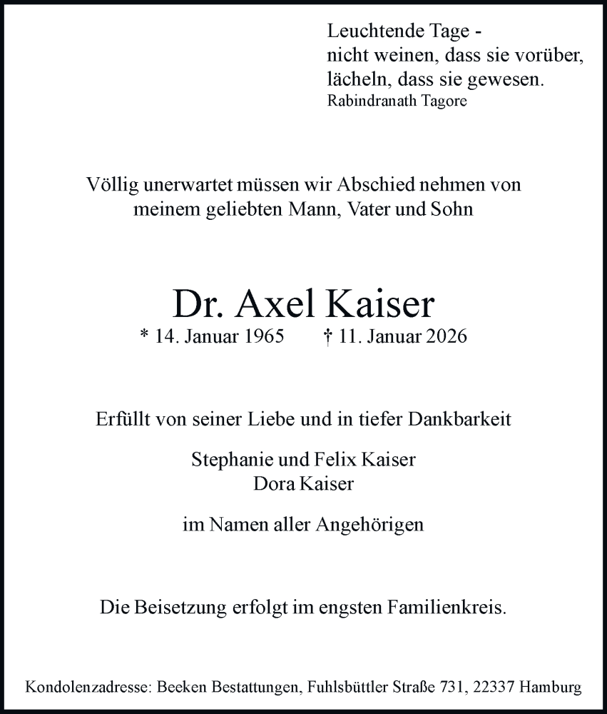 Hier finden Sie alle Traueranzeigen aus der Zeitung, die bisher für Axel Kaiser erschienen sind. Weitere Traueranzeigen, die in der Zeitung erscheinen, werden hier ebenfalls aufgelistet