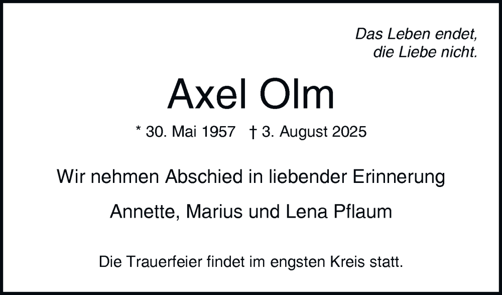 Hier finden Sie alle Traueranzeigen aus der Zeitung, die bisher für Axel Olm erschienen sind. Weitere Traueranzeigen, die in der Zeitung erscheinen, werden hier ebenfalls aufgelistet