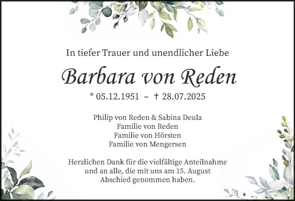Hier finden Sie alle Traueranzeigen aus der Zeitung, die bisher für Barbara von Reden erschienen sind. Weitere Traueranzeigen, die in der Zeitung erscheinen, werden hier ebenfalls aufgelistet