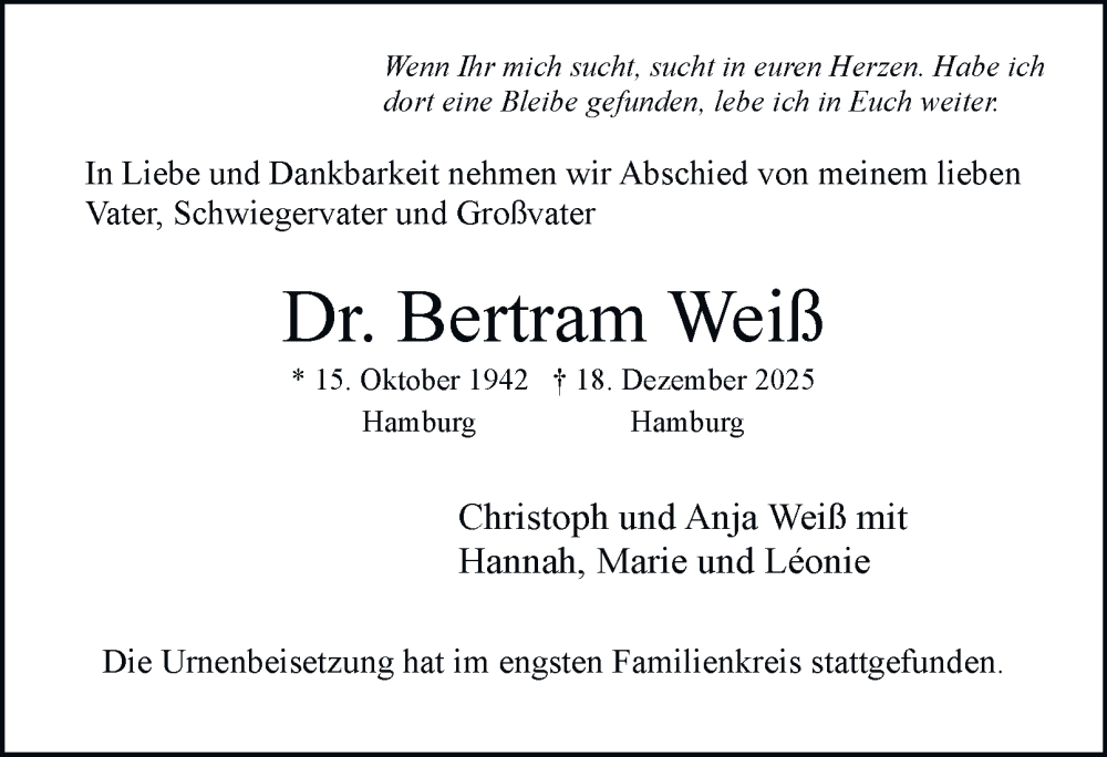 Hier finden Sie alle Traueranzeigen aus der Zeitung, die bisher für Bertram Weiß erschienen sind. Weitere Traueranzeigen, die in der Zeitung erscheinen, werden hier ebenfalls aufgelistet