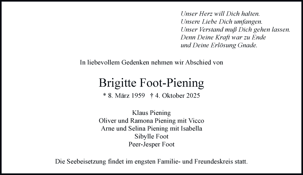 Hier finden Sie alle Traueranzeigen aus der Zeitung, die bisher für Brigitte Foot-Piening erschienen sind. Weitere Traueranzeigen, die in der Zeitung erscheinen, werden hier ebenfalls aufgelistet