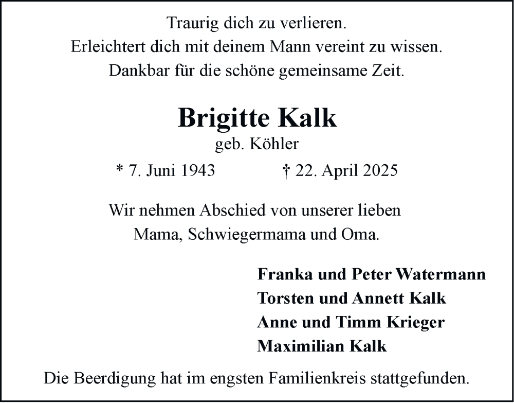 Hier finden Sie alle Traueranzeigen aus der Zeitung, die bisher für Brigitte Kalk erschienen sind. Weitere Traueranzeigen, die in der Zeitung erscheinen, werden hier ebenfalls aufgelistet
