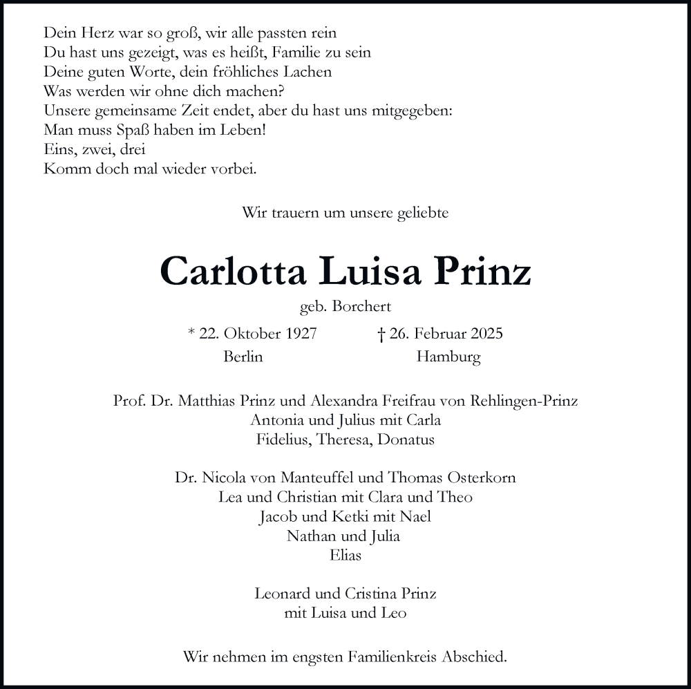 Hier finden Sie alle Traueranzeigen aus der Zeitung, die bisher für Carlotta Luisa Prinz erschienen sind. Weitere Traueranzeigen, die in der Zeitung erscheinen, werden hier ebenfalls aufgelistet
