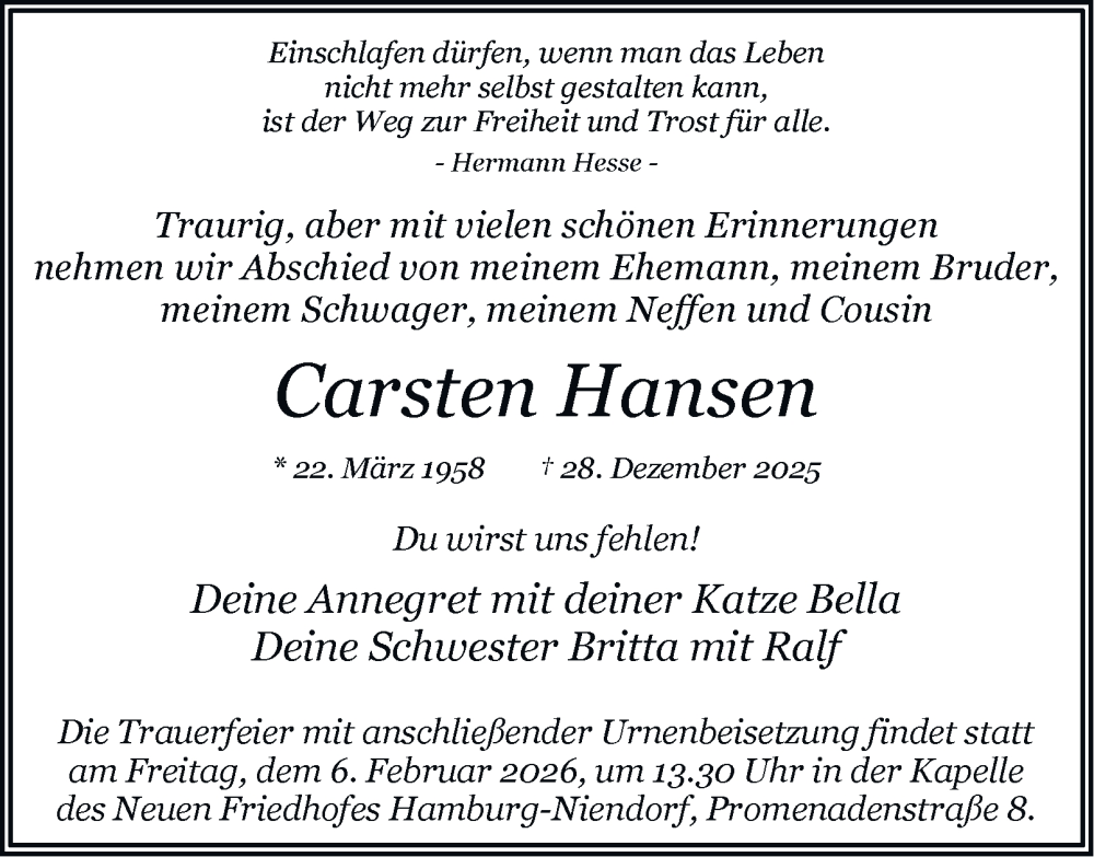 Hier finden Sie alle Traueranzeigen aus der Zeitung, die bisher für Carsten Hansen erschienen sind. Weitere Traueranzeigen, die in der Zeitung erscheinen, werden hier ebenfalls aufgelistet
