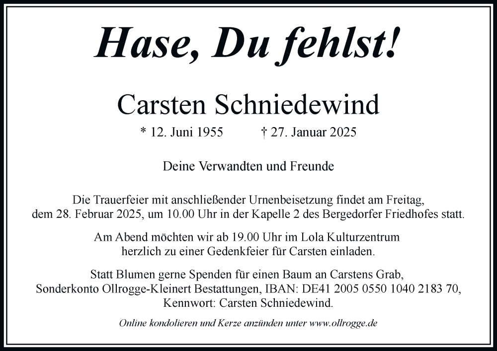 Hier finden Sie alle Traueranzeigen aus der Zeitung, die bisher für Carsten Schniedewind erschienen sind. Weitere Traueranzeigen, die in der Zeitung erscheinen, werden hier ebenfalls aufgelistet