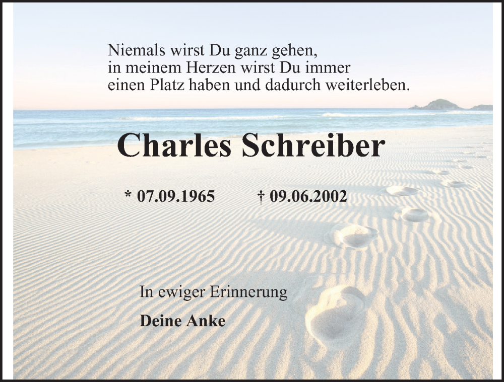 Hier finden Sie alle Traueranzeigen aus der Zeitung, die bisher für Charles Schreiber erschienen sind. Weitere Traueranzeigen, die in der Zeitung erscheinen, werden hier ebenfalls aufgelistet