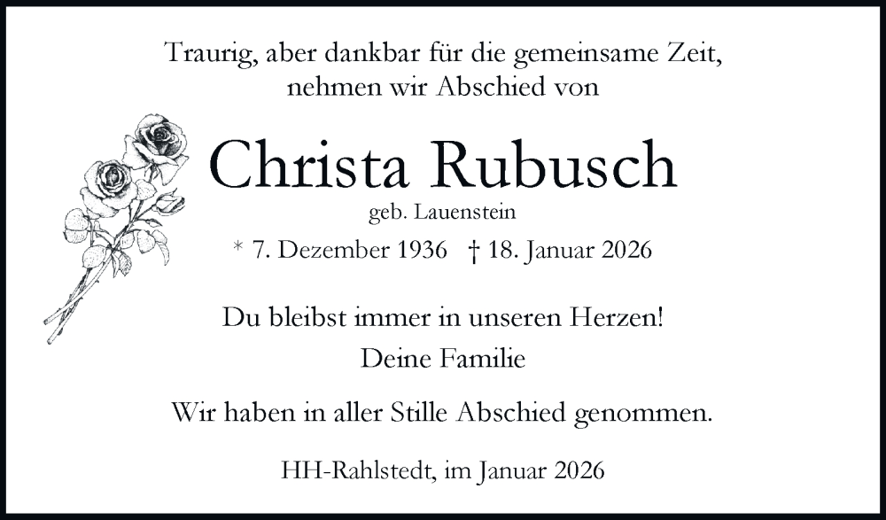 Hier finden Sie alle Traueranzeigen aus der Zeitung, die bisher für Christa Rubusch erschienen sind. Weitere Traueranzeigen, die in der Zeitung erscheinen, werden hier ebenfalls aufgelistet