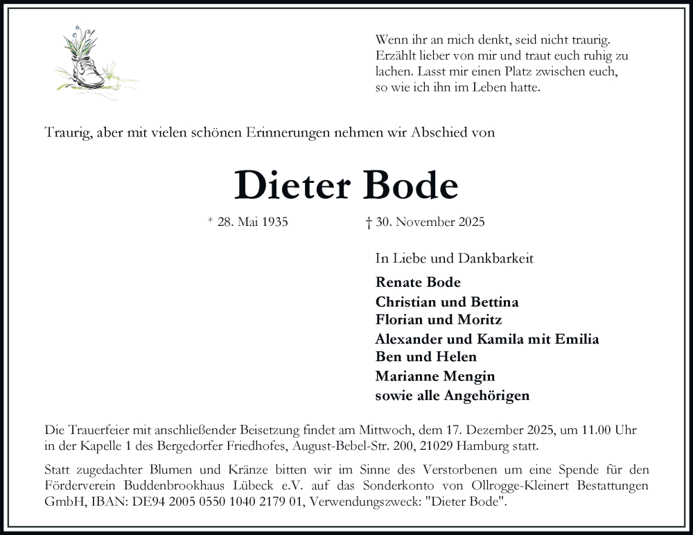 Hier finden Sie alle Traueranzeigen aus der Zeitung, die bisher für Dieter Bode erschienen sind. Weitere Traueranzeigen, die in der Zeitung erscheinen, werden hier ebenfalls aufgelistet