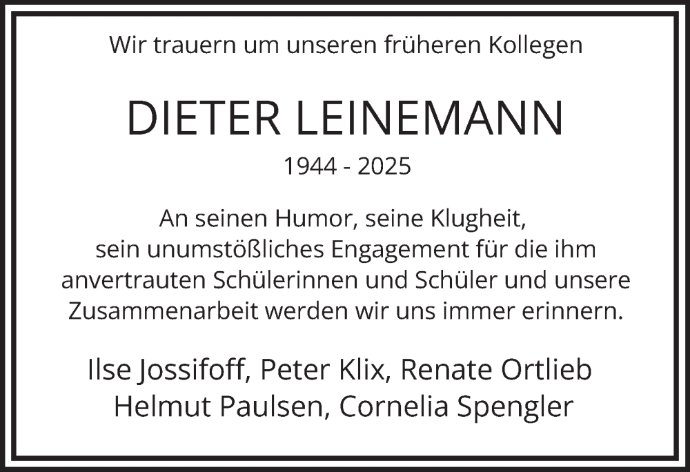 Hier finden Sie alle Traueranzeigen aus der Zeitung, die bisher für Dieter Leinemann erschienen sind. Weitere Traueranzeigen, die in der Zeitung erscheinen, werden hier ebenfalls aufgelistet