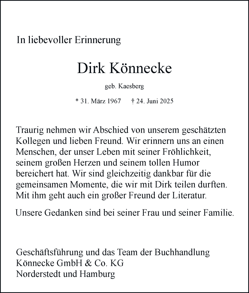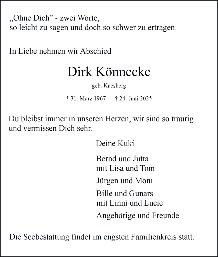 Hier finden Sie alle Traueranzeigen aus der Zeitung, die bisher für Dirk Könnecke erschienen sind. Weitere Traueranzeigen, die in der Zeitung erscheinen, werden hier ebenfalls aufgelistet