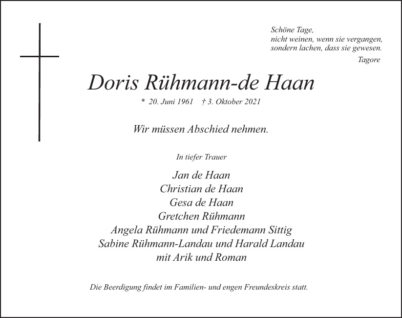 Hier finden Sie alle Traueranzeigen aus der Zeitung, die bisher für Doris Rühmann-de Haan erschienen sind. Weitere Traueranzeigen, die in der Zeitung erscheinen, werden hier ebenfalls aufgelistet