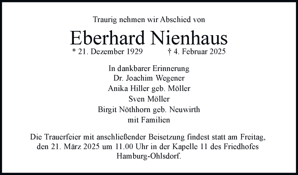 Hier finden Sie alle Traueranzeigen aus der Zeitung, die bisher für Eberhard Nienhaus erschienen sind. Weitere Traueranzeigen, die in der Zeitung erscheinen, werden hier ebenfalls aufgelistet