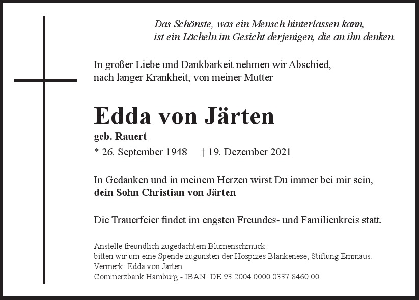 Hier finden Sie alle Traueranzeigen aus der Zeitung, die bisher für Edda von Järten erschienen sind. Weitere Traueranzeigen, die in der Zeitung erscheinen, werden hier ebenfalls aufgelistet