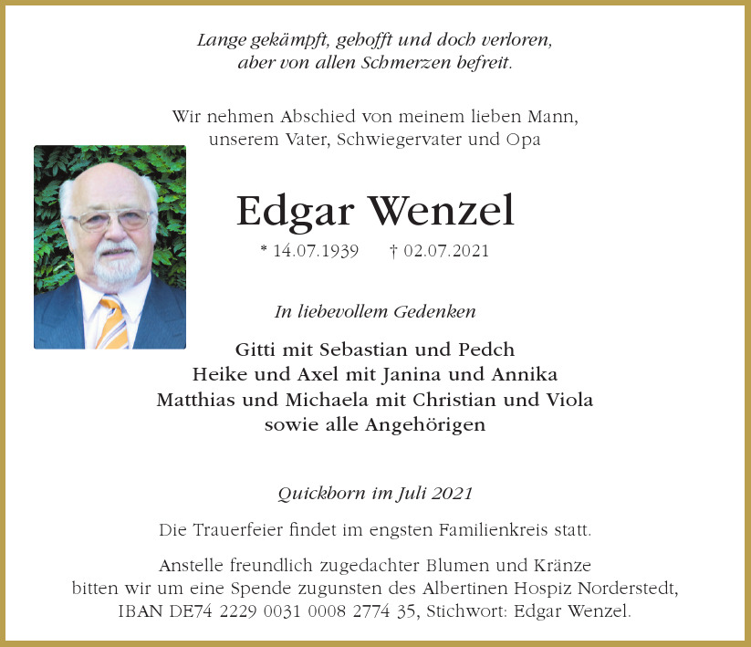 Hier finden Sie alle Traueranzeigen aus der Zeitung, die bisher für Edgar Wenzel erschienen sind. Weitere Traueranzeigen, die in der Zeitung erscheinen, werden hier ebenfalls aufgelistet
