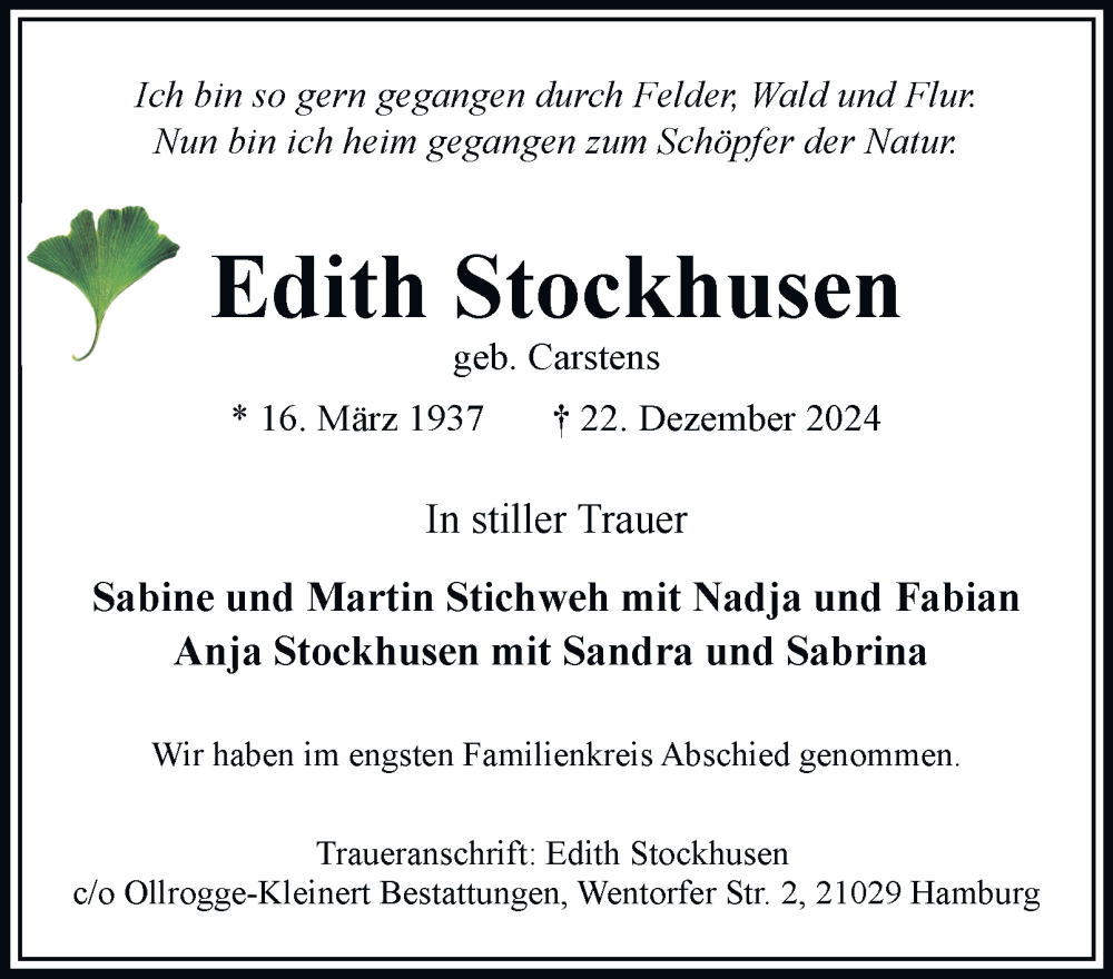 Hier finden Sie alle Traueranzeigen aus der Zeitung, die bisher für Edith Stockhusen erschienen sind. Weitere Traueranzeigen, die in der Zeitung erscheinen, werden hier ebenfalls aufgelistet