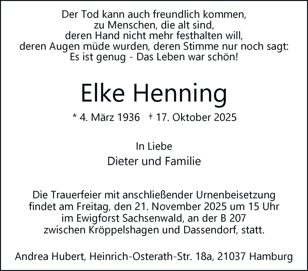 Hier finden Sie alle Traueranzeigen aus der Zeitung, die bisher für Elke Henning erschienen sind. Weitere Traueranzeigen, die in der Zeitung erscheinen, werden hier ebenfalls aufgelistet