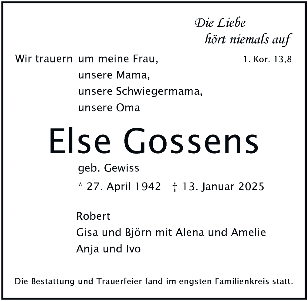 Hier finden Sie alle Traueranzeigen aus der Zeitung, die bisher für Else Gossens erschienen sind. Weitere Traueranzeigen, die in der Zeitung erscheinen, werden hier ebenfalls aufgelistet