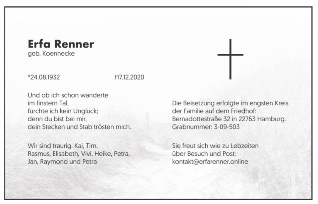 Hier finden Sie alle Traueranzeigen aus der Zeitung, die bisher für Erfa Renner erschienen sind. Weitere Traueranzeigen, die in der Zeitung erscheinen, werden hier ebenfalls aufgelistet