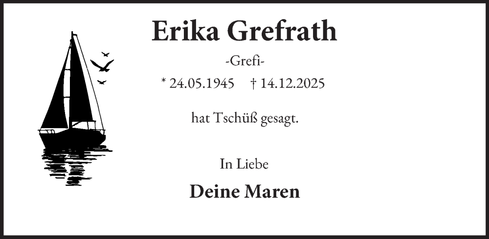 Hier finden Sie alle Traueranzeigen aus der Zeitung, die bisher für Erika Grefrath erschienen sind. Weitere Traueranzeigen, die in der Zeitung erscheinen, werden hier ebenfalls aufgelistet