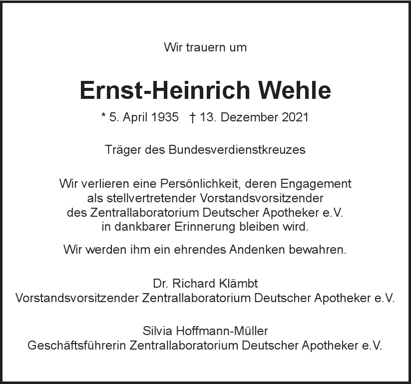 Hier finden Sie alle Traueranzeigen aus der Zeitung, die bisher für Ernst-Heinrich Wehle erschienen sind. Weitere Traueranzeigen, die in der Zeitung erscheinen, werden hier ebenfalls aufgelistet