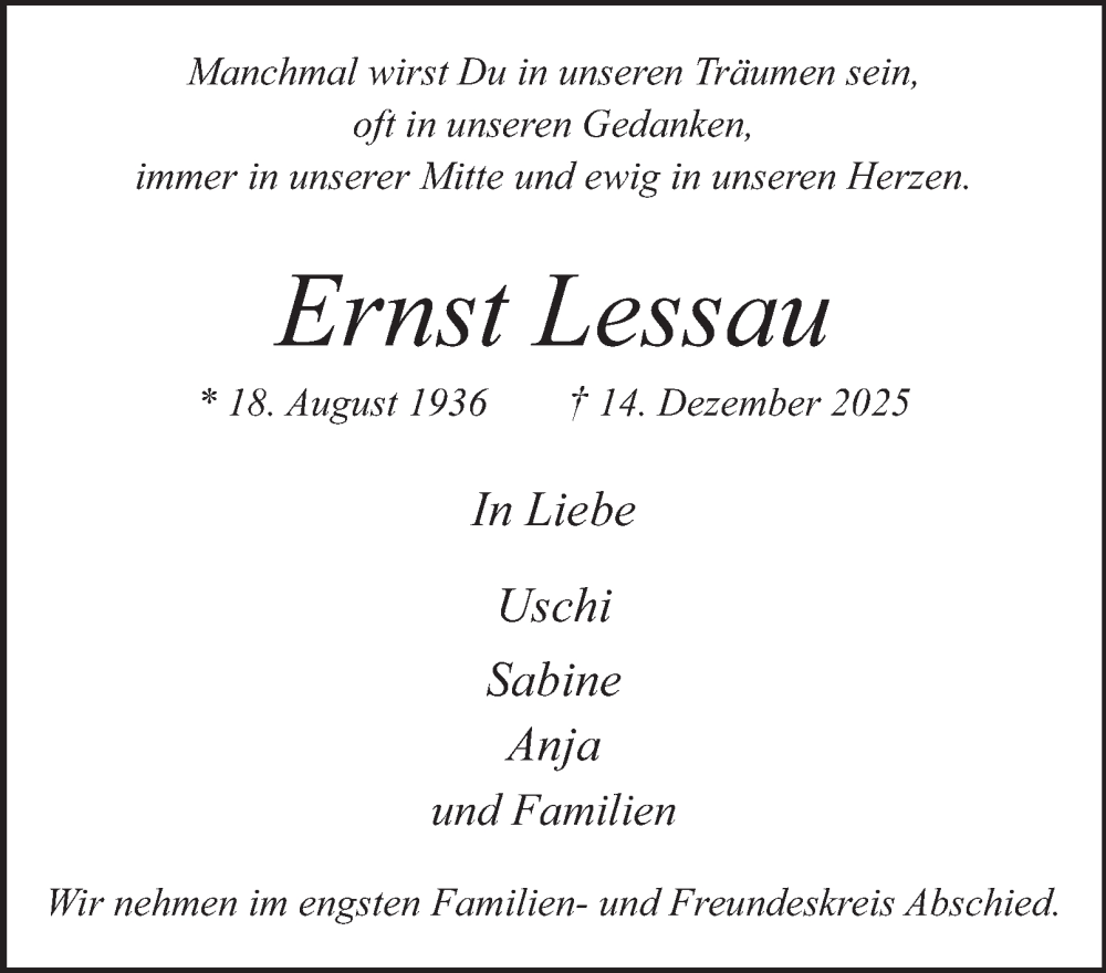 Hier finden Sie alle Traueranzeigen aus der Zeitung, die bisher für Ernst Lessau erschienen sind. Weitere Traueranzeigen, die in der Zeitung erscheinen, werden hier ebenfalls aufgelistet