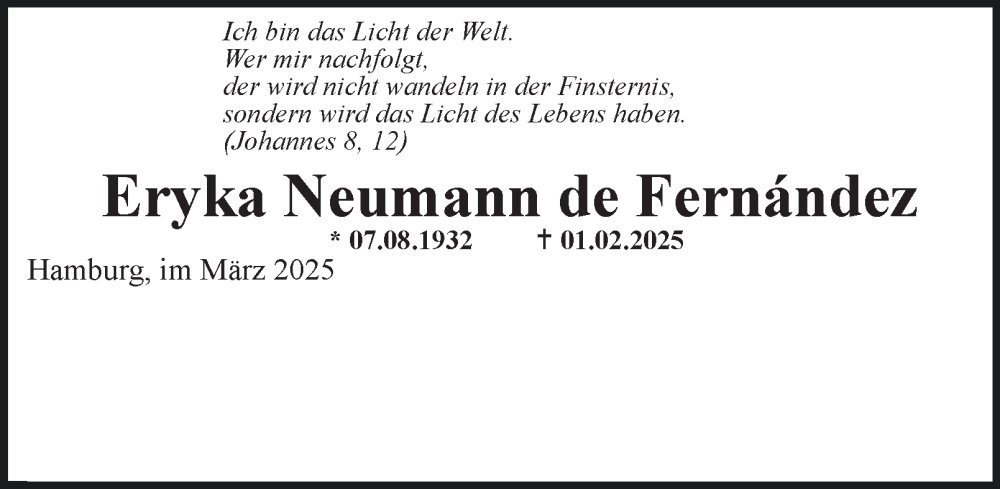 Hier finden Sie alle Traueranzeigen aus der Zeitung, die bisher für Eryka Neumann de Fernandez erschienen sind. Weitere Traueranzeigen, die in der Zeitung erscheinen, werden hier ebenfalls aufgelistet