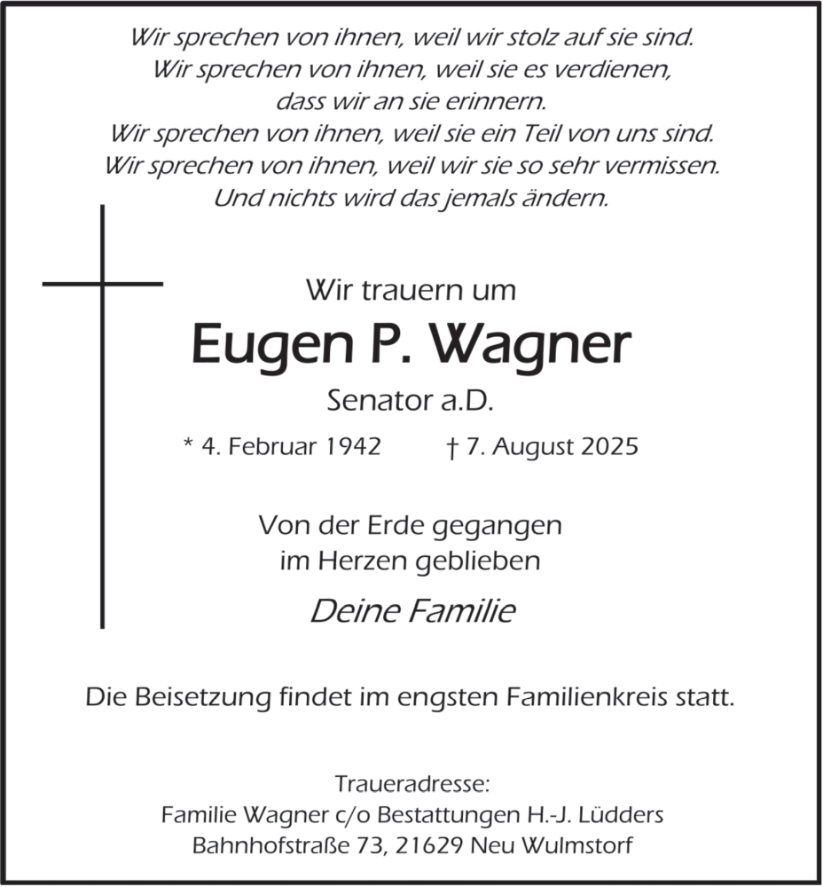 Hier finden Sie alle Traueranzeigen aus der Zeitung, die bisher für Eugen Wagner erschienen sind. Weitere Traueranzeigen, die in der Zeitung erscheinen, werden hier ebenfalls aufgelistet