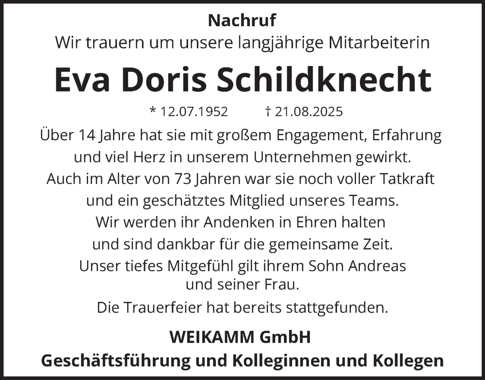 Hier finden Sie alle Traueranzeigen aus der Zeitung, die bisher für Eva Doris Schildknecht erschienen sind. Weitere Traueranzeigen, die in der Zeitung erscheinen, werden hier ebenfalls aufgelistet