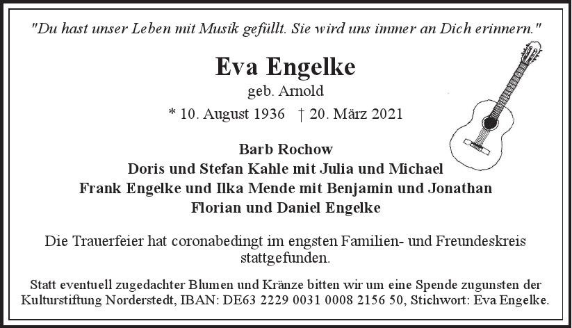 Hier finden Sie alle Traueranzeigen aus der Zeitung, die bisher für Eva Engelke erschienen sind. Weitere Traueranzeigen, die in der Zeitung erscheinen, werden hier ebenfalls aufgelistet
