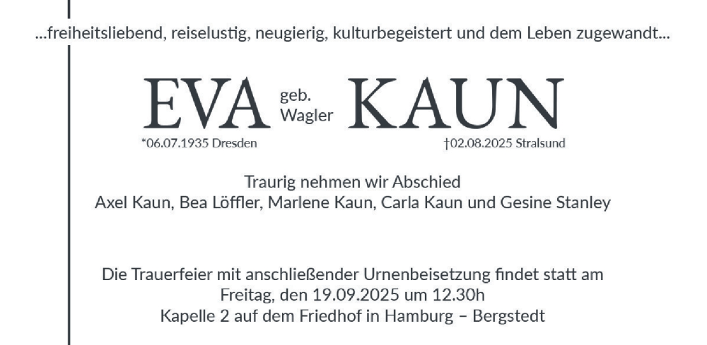 Hier finden Sie alle Traueranzeigen aus der Zeitung, die bisher für Eva Kaun erschienen sind. Weitere Traueranzeigen, die in der Zeitung erscheinen, werden hier ebenfalls aufgelistet
