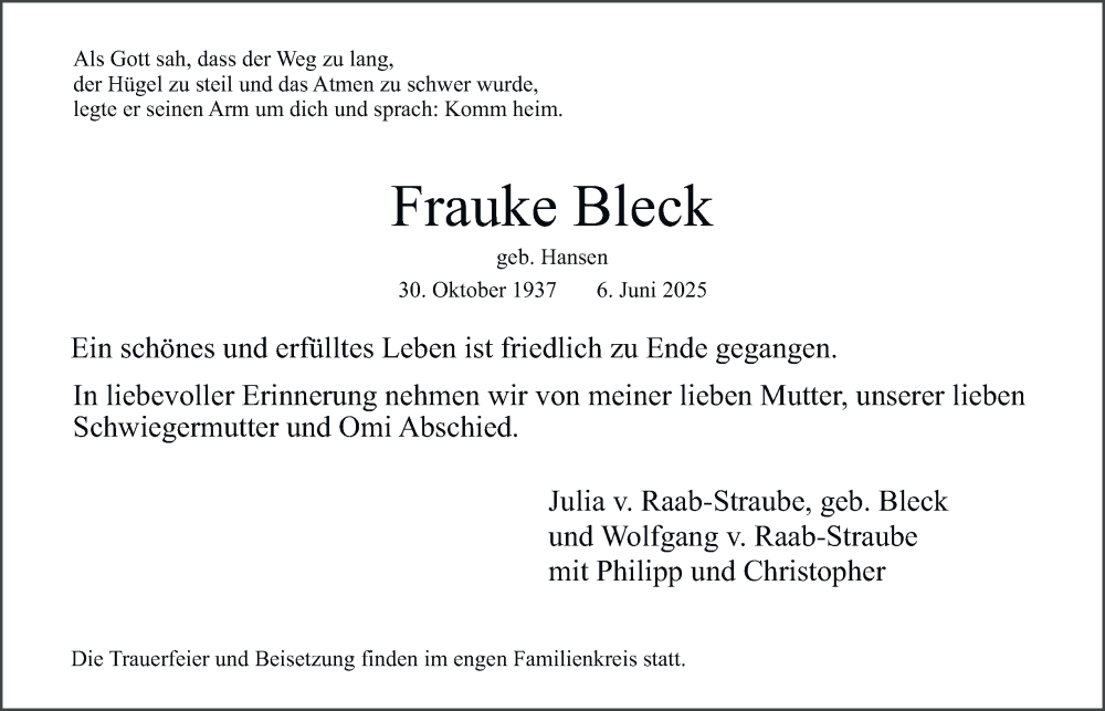 Hier finden Sie alle Traueranzeigen aus der Zeitung, die bisher für Frauke Bleck erschienen sind. Weitere Traueranzeigen, die in der Zeitung erscheinen, werden hier ebenfalls aufgelistet