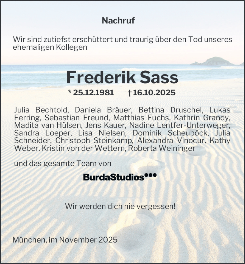 Hier finden Sie alle Traueranzeigen aus der Zeitung, die bisher für Frederik Sass erschienen sind. Weitere Traueranzeigen, die in der Zeitung erscheinen, werden hier ebenfalls aufgelistet