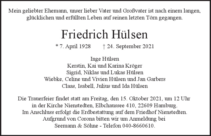 Hier finden Sie alle Traueranzeigen aus der Zeitung, die bisher für Friedrich Hülsen erschienen sind. Weitere Traueranzeigen, die in der Zeitung erscheinen, werden hier ebenfalls aufgelistet