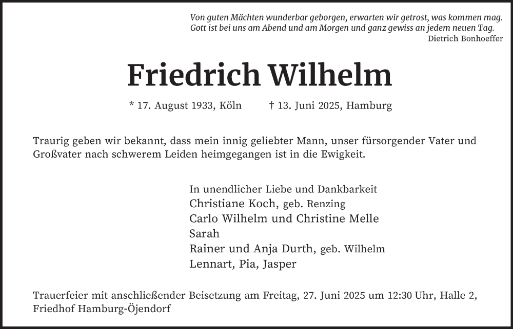 Hier finden Sie alle Traueranzeigen aus der Zeitung, die bisher für Friedrich Wilhelm erschienen sind. Weitere Traueranzeigen, die in der Zeitung erscheinen, werden hier ebenfalls aufgelistet