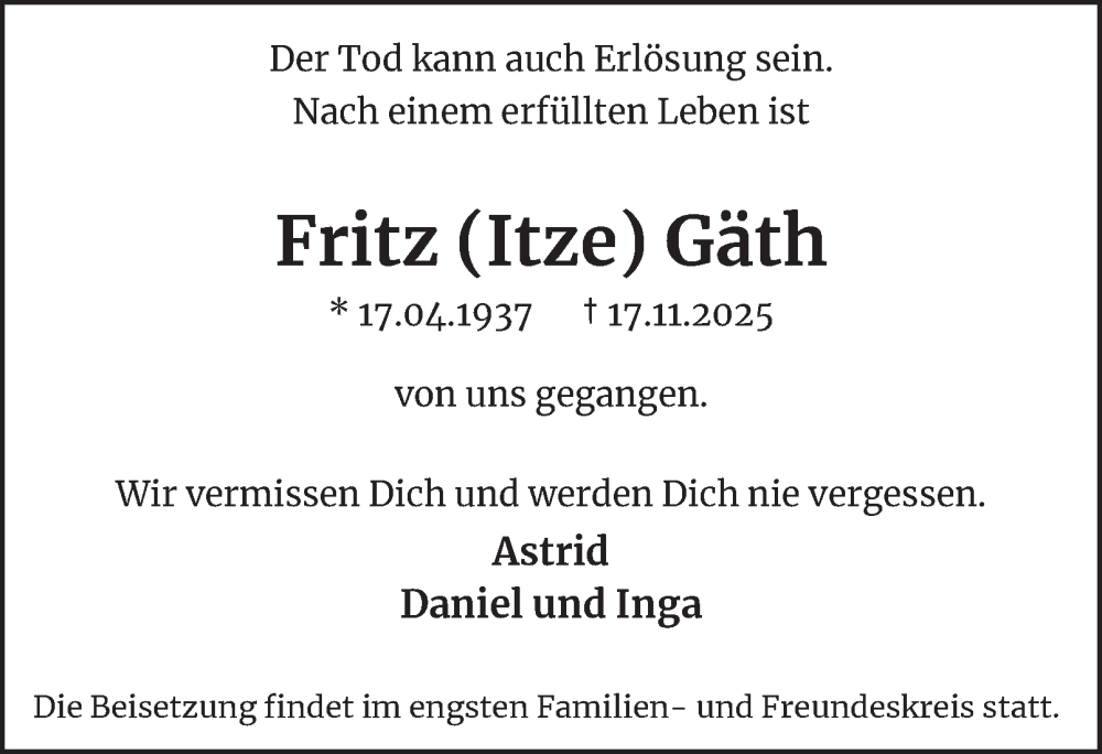 Hier finden Sie alle Traueranzeigen aus der Zeitung, die bisher für Fritz Gäth erschienen sind. Weitere Traueranzeigen, die in der Zeitung erscheinen, werden hier ebenfalls aufgelistet