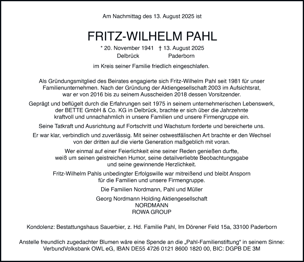 Hier finden Sie alle Traueranzeigen aus der Zeitung, die bisher für Fritz-Wilhelm Pahl erschienen sind. Weitere Traueranzeigen, die in der Zeitung erscheinen, werden hier ebenfalls aufgelistet