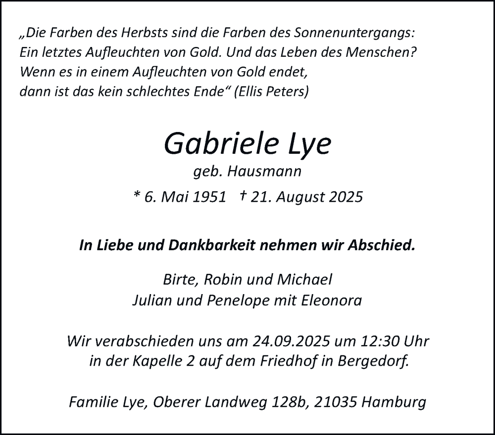 Hier finden Sie alle Traueranzeigen aus der Zeitung, die bisher für Gabriele Lye erschienen sind. Weitere Traueranzeigen, die in der Zeitung erscheinen, werden hier ebenfalls aufgelistet
