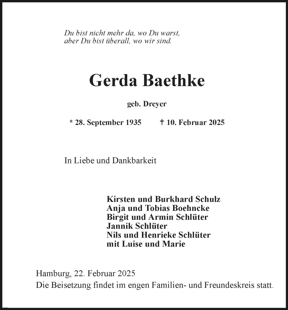 Hier finden Sie alle Traueranzeigen aus der Zeitung, die bisher für Gerda Baethke erschienen sind. Weitere Traueranzeigen, die in der Zeitung erscheinen, werden hier ebenfalls aufgelistet