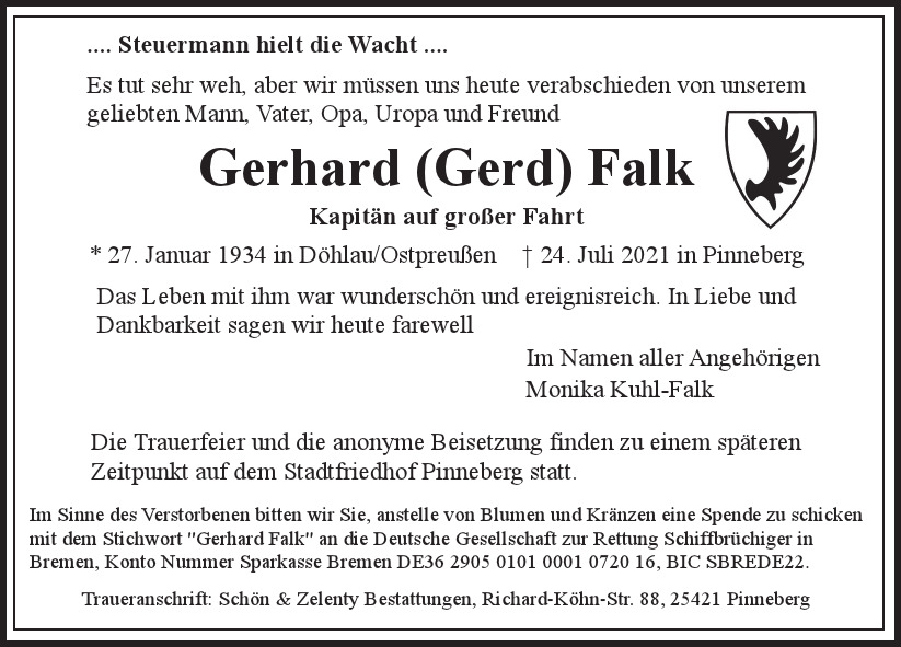 Hier finden Sie alle Traueranzeigen aus der Zeitung, die bisher für Gerhard Gerd Falk erschienen sind. Weitere Traueranzeigen, die in der Zeitung erscheinen, werden hier ebenfalls aufgelistet
