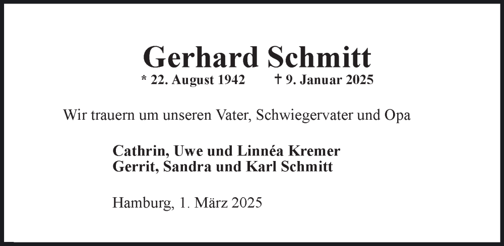 Hier finden Sie alle Traueranzeigen aus der Zeitung, die bisher für Gerhard Schmitt erschienen sind. Weitere Traueranzeigen, die in der Zeitung erscheinen, werden hier ebenfalls aufgelistet
