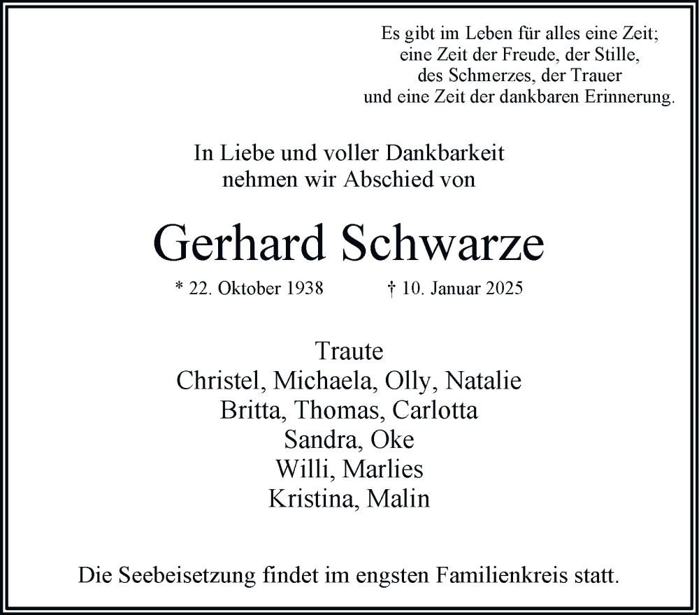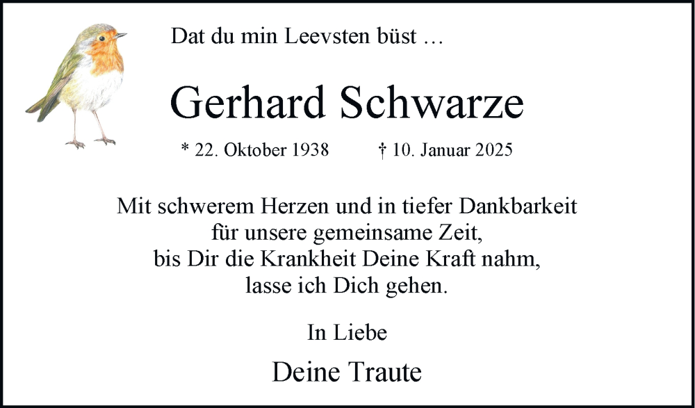 Hier finden Sie alle Traueranzeigen aus der Zeitung, die bisher für Gerhard Schwarze erschienen sind. Weitere Traueranzeigen, die in der Zeitung erscheinen, werden hier ebenfalls aufgelistet