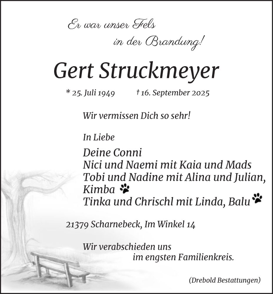 Hier finden Sie alle Traueranzeigen aus der Zeitung, die bisher für Gert Struckmeyer erschienen sind. Weitere Traueranzeigen, die in der Zeitung erscheinen, werden hier ebenfalls aufgelistet