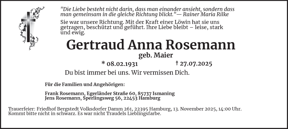 Hier finden Sie alle Traueranzeigen aus der Zeitung, die bisher für Gertraud Anna Rosemann erschienen sind. Weitere Traueranzeigen, die in der Zeitung erscheinen, werden hier ebenfalls aufgelistet