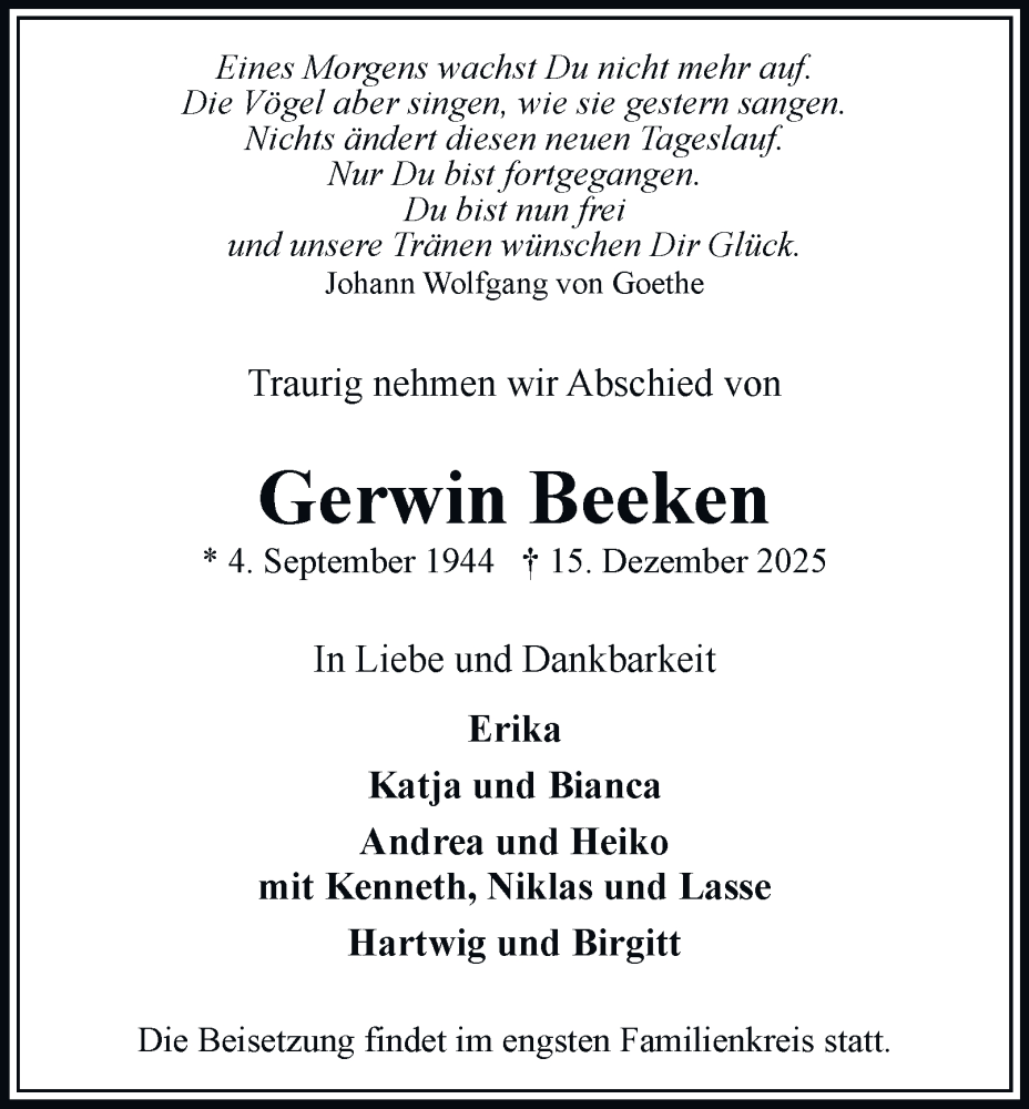 Hier finden Sie alle Traueranzeigen aus der Zeitung, die bisher für Gerwin Beeken erschienen sind. Weitere Traueranzeigen, die in der Zeitung erscheinen, werden hier ebenfalls aufgelistet